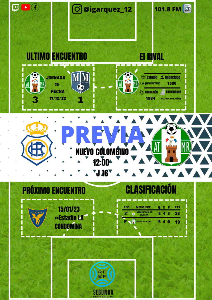 Recreativo de Huelva y Mancha Real, disputarán el domingo 8 de enero, el partido correspondiente a la jornada 16 de liga, Primera vez en la historia que ambos conjuntos se podrán ver las caras en un partido. El partido se podrá seguir a través de radio en: Twitch, YouTube o Facebook de Hispanidad Radio además de la FM 101.8. uniendo en ella misma juventud y veteranía.