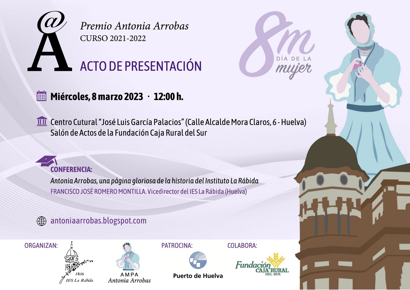 Dentro de los actos del 8M, y dando continuidad a la creación el curso pasado del Premio Antonia Arrobas, desde el AMPA y el Instituto La Rábida hemos organizado una acto de presentación de la segunda edición del premio Antonia Arrobas, para que sirva como pistoletazo de salida a la presentación de candidatas.El premio Antonia Arrobas quiere premiar a la alumna más destacada de la provincia de Huelva en Secundaria, que haya finalizado una etapa, bien sea la de ESO como la de Bachillerato. El año pasado este premio fue entregado a Violeta Acuña, de Valverde del Camino, como la alumna más destacada de la provincia de Huelva en el curso 2020-2021.