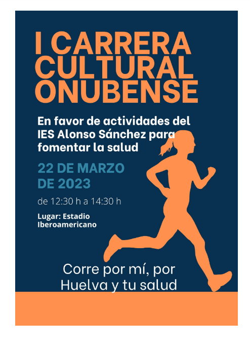 1.- El IES Alonso Sánchez de Huelva, a través del proyecto de los alumnos de segundo de bachillerato de E.F., y con la colaboración de todos los departamentos y los alumnos del centro, organiza la 1ª edición de la Carrera Cultural Onubense, “Corre por mí, corre por Huelva y por tu salud 2023”, que se celebrará el miércoles 22 de marzo de 2023. La carrera se llevará a cabo en el Estadio Iberoamericano de la Diputación Provincial de Huelva a las 12:30 de la mañana hasta las 14:30 de la tarde.