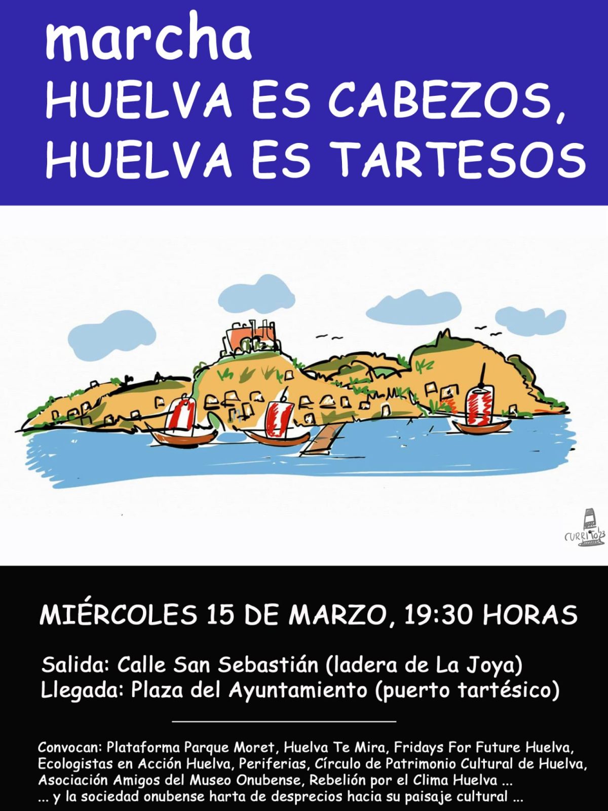Colectivos onubenses convocan hoy 15 de marzo una nueva movilización por el patrimonio natural y cultural onubense. Bajo el lema “Huelva es Cabezos, Huelva es Tartesos” hacen un llamamiento a la sociedad onubense para secundar una marcha que partirá a las 19:30 horas de la tarde de la Calle San Sebastián, a los pies de Las Joya, que acoge la importante Necrópolis Tartésica , y recorrerá algunas calles del centro hasta la Plaza de la Constitución, entre el Ayuntamiento y el antiguo solar de Hacienda, futura sede de la Delegación del Gobierno Andaluz, donde apareciera hace un año los restos del puerto tartésico. Ambas administraciones son objetivo de las demandas ciudadanas.