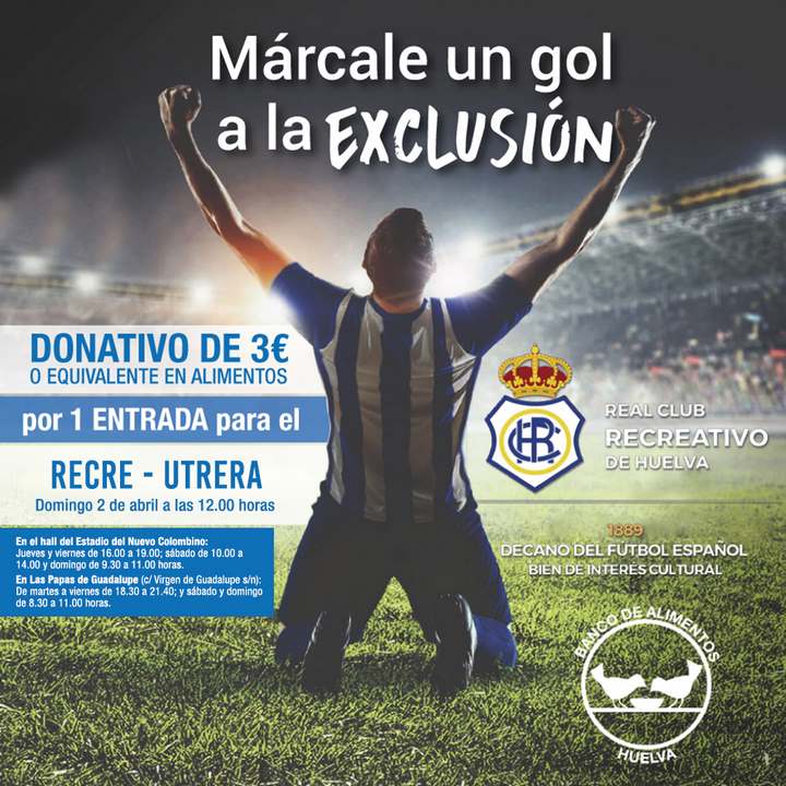 El Banco de Alimentos de Huelva (BAH) y el Real Club Recreativo de Huelva ponen en marcha esta semana una iniciativa por medio de la cual los onubenses pueden conseguir entradas para el partido que enfrentará al Decano con el Utrera por un módico donativo de 3€ o el equivalente en alimentos para atender las necesidades actuales de las personas beneficiarias del Banco de Alimentos.