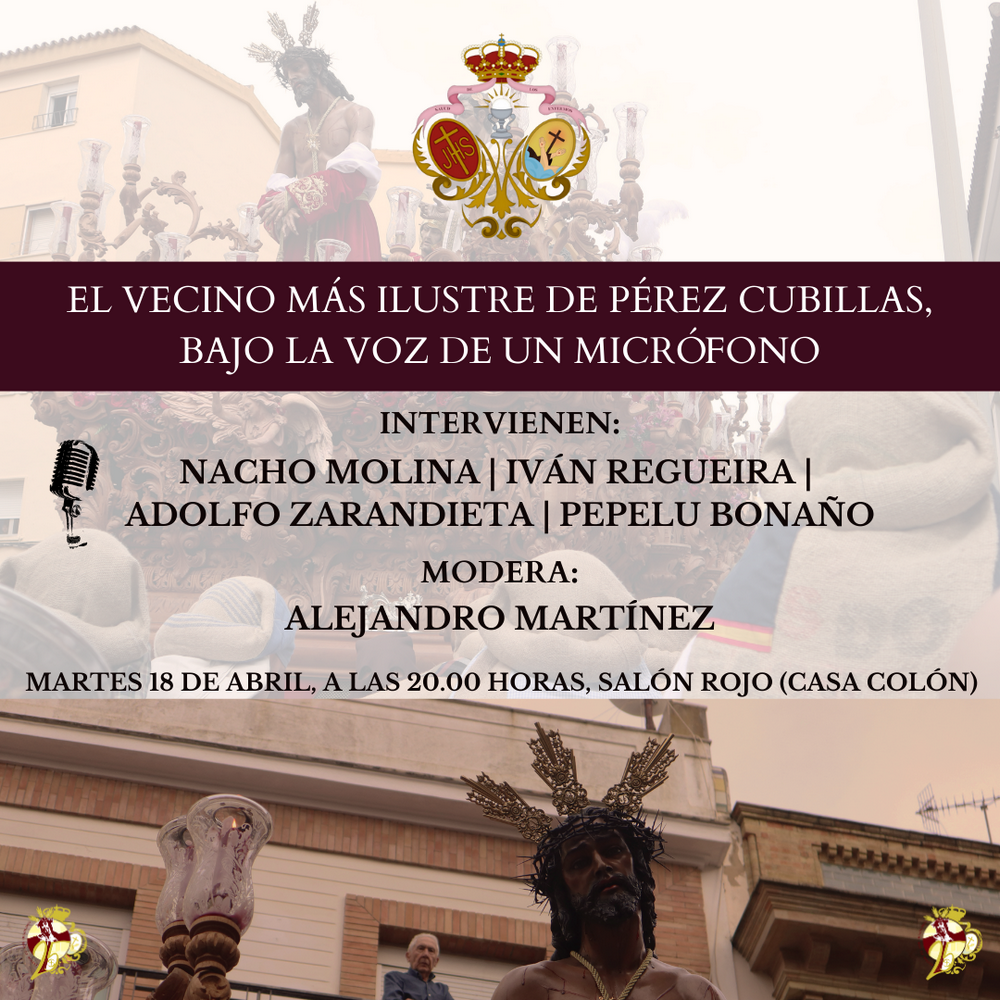 La cofradía del Martes Santo retoma, tras una mágica Semana Santa, los actos y cultos del XXV aniversario de la llegada y bendición de Nuestro Padre Jesús de la Sentencia este martes 18 de abril, a las 20.00 horas, con una charla-coloquio, titulada ‘El Vecino más Ilustre de Pérez Cubillas, bajo la voz de un micrófono’, en la Casa Colón (Salón Rojo). Intervendrán Nacho Molina, Iván Regueira, Adolfo Zarandieta y Pepelu Bonaño, comunicadores de diferentes medios de comunicación de Huelva. El acto será presentado y moderado por Alejandro Martínez Piosa.