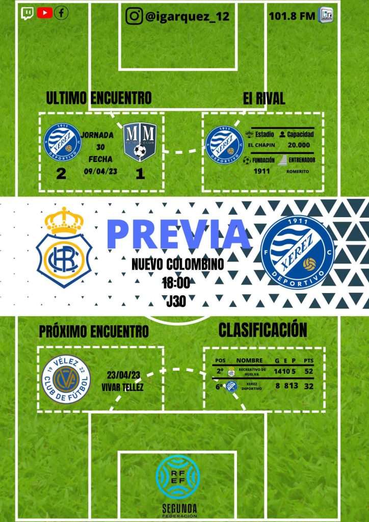 Xerez Deportivo y Recreativo de Huelva, disputarán un gran duelo el próximo domingo. Partido de liga correspondiente a la 30º jornada de la 2 RFEF. Lo más destacado del encuentro es la tensión existente entre ambas aficiones enfrentadas. El partido se podrá seguir a través de radio en: Twitch, YouTube o Facebook de Hispanidad Radio además de la FM 101.8.