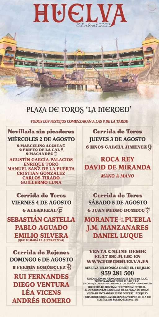 “Una Feria de Colombinas 2023 que cuenta con muchos alicientes para que el aficionado acuda en masa. También contaremos con la máxima figura del momento, Andrés Roca Rey, que encantado aceptó el ‘mano a mano’ con David de Miranda, máximo exponente del toreo en la ciudad. El día 3 de agosto las figuras del toreo lo guardaban para venir a Huelva en su día grande. Daniel Luque máximo triunfador de la temporada y que nos regaló una tarde soñada el pasado año con el indulto de ‘Manzanillo’ de Juan Pedro Domecq. Pablo Aguado, un torero muy querido en Huelva y que cuajó una de las tardes más importantes de su carrera aquí en –La Merced- en agosto de 2019”.