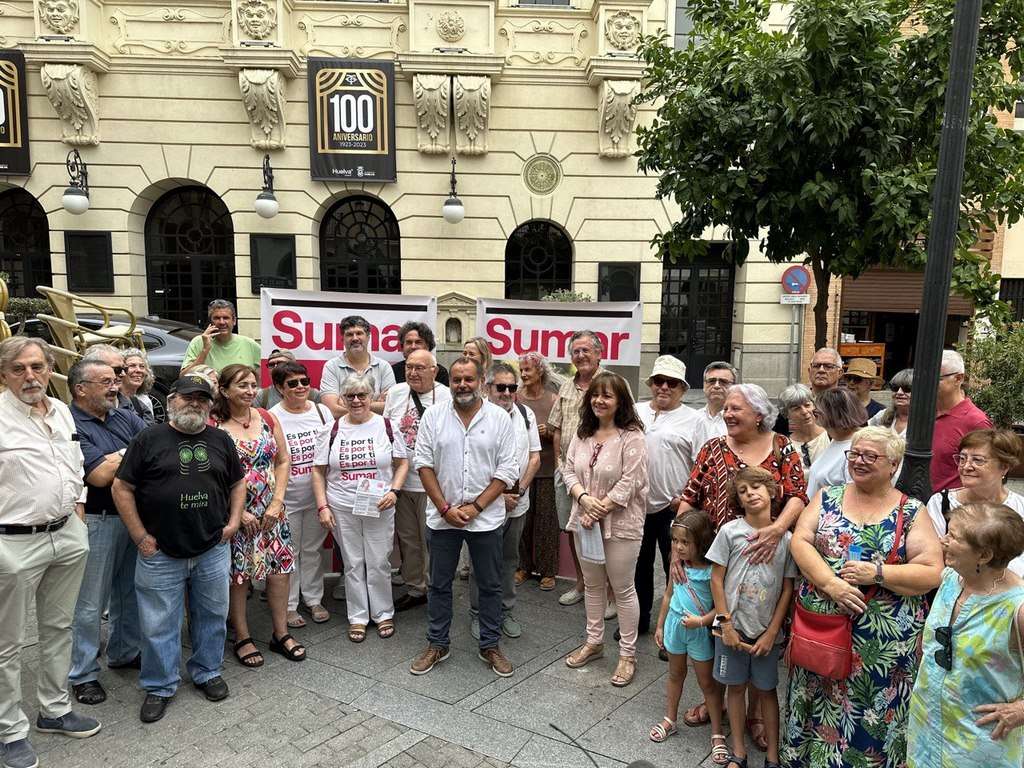 Huelva, 18 de julio.- El candidato al Congreso de los Diputados por Sumar en la provincia de Huelva Rafael Sánchez Rufo junto a una treintena de simpatizantes de la coalición ha presentado esta mañana un manifiesto que han firmado más de 220 activistas de diferentes ámbitos como la cultura, la sanidad, el activismo sindical y medioambiental y numerosas asociaciones de la sociedad civil onubense.