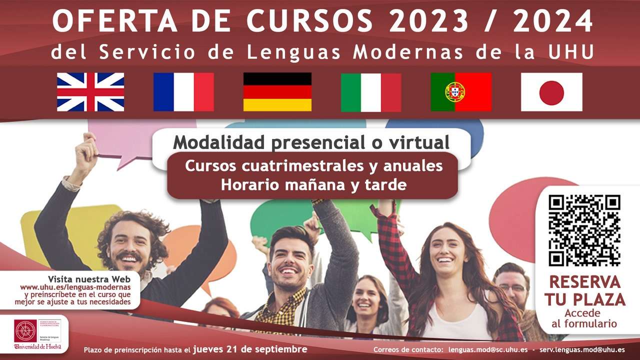 El Servicio de Lenguas Modernas (SLM) de la Universidad de Huelva ha publicado su Oferta de Cursos 2023/2024 de lenguas extranjeras, en una edición donde se ha vuelto a pensar en las necesidades de cada persona, apostando por la modalidad de enseñanza virtual, además de la presencial.