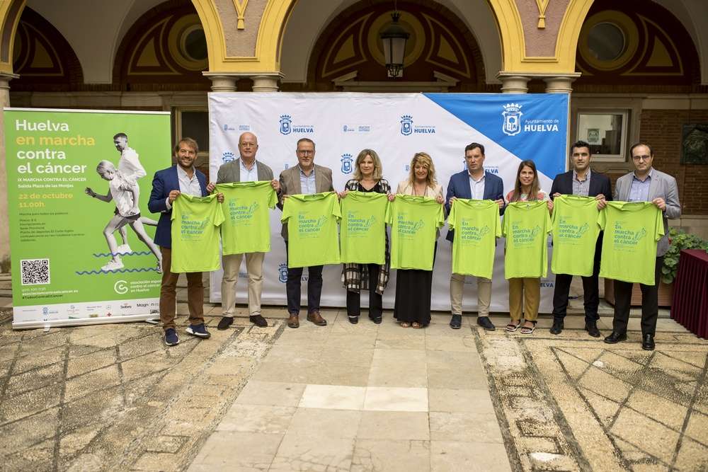 Huelva, 27 de julio de 2023.- La capital onubense acogerá el domingo 22 de octubre a las 11.00 horas la novena edición de ‘Huelva marcha contra el cáncer’, iniciativa de la Asociación Española contra el Cáncer en Huelva que convertirá Huelva en una marea verde y que esta mañana se ha presentado en el Patio del Ayuntamiento de Huelva, contando con el respaldo del Ayuntamiento de Huelva y de la Autoridad Portuaria, así como de las entidades onubenses patrocinadoras Adarsa-Sur, Seabery y el Complejo Energético Magnon en Huelva.