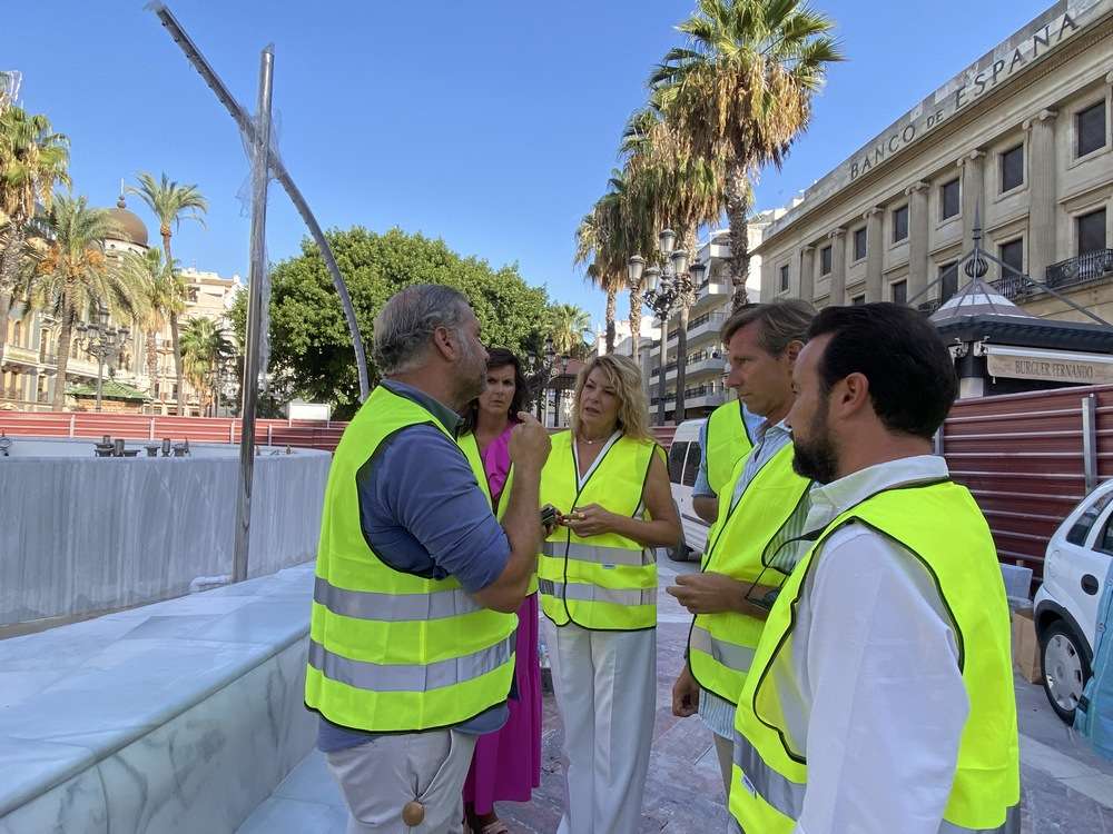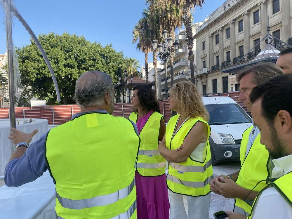 La alcaldesa de Huelva, Pilar Miranda, acompañada por la concejala de Infraestructuras y Servicios Públicos, Mariló Ponce; y el concejal de Economía y Hacienda, Francisco Muñoz, ha comprobado esta mañana el gran avance de las obras de la fuente de la Plaza de las Monjas. Unos trabajos impulsados por el Ayuntamiento de Huelva que están avanzando a muy buen ritmo y que se encuentran ya en su recta final, procediéndose a colocar los últimos plintos de mármol y haciéndose las pruebas pertinentes de llenado.