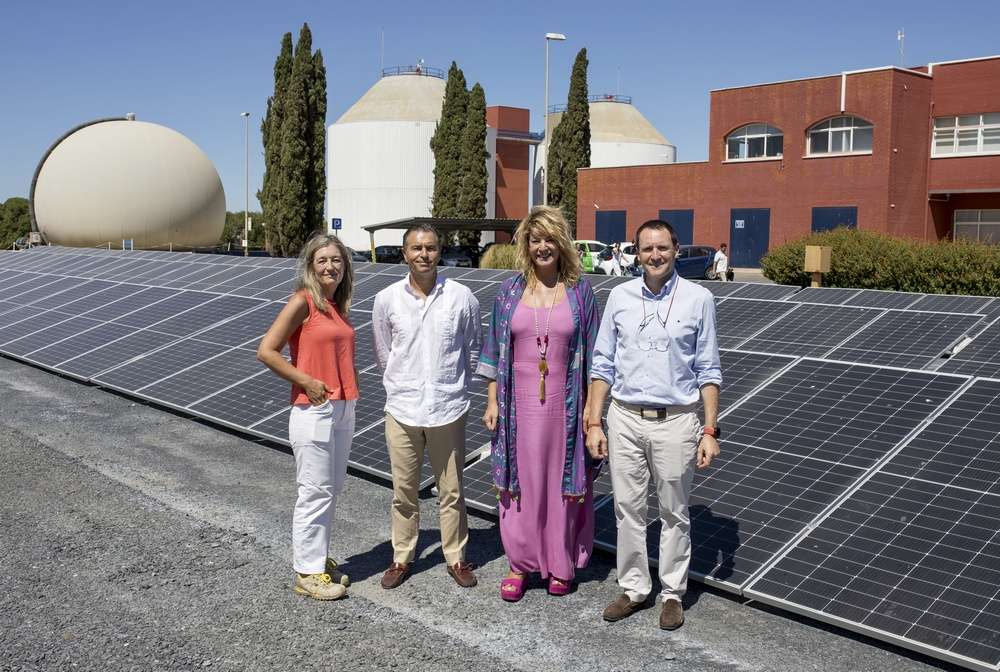 La alcaldesa de Huelva, Pilar Miranda, ha visitado la Estación Depuradora de Aguas Residuales (EDAR) de la empresa Aguas de Huelva para conocer las nuevas instalaciones de placas fotovoltaicas que la empresa ha colocado para reducir sus emisiones de CO2 y fomentar el autoconsumo energético. Durante la visita, la alcaldesa ha estado acompañada por el primer teniente alcalde de Urbanismo y Medio Ambiente y presidente de Aguas de Huelva, Felipe Arias; el director gerente de Aguas de Huelva, Pedro Peña; y la directora de operaciones de la entidad, Guadalupe Carrasco.