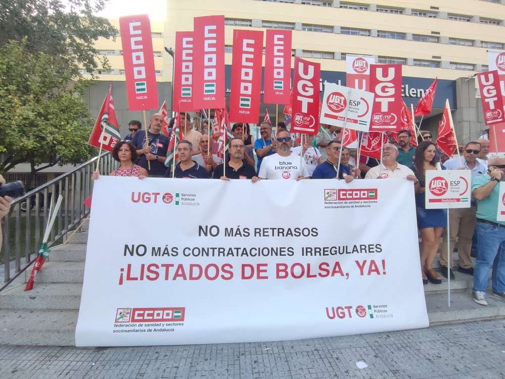 Más de un centenar de trabajadores y trabajadoras se concentraron hoy en el Hospital Infanta Elena de Huelva en una protesta, liderada por CCOO, en contra de la decisión del Servicio Andaluz de Salud (SAS) de bloquear la actualización de la Bolsa de Contratación Temporal.