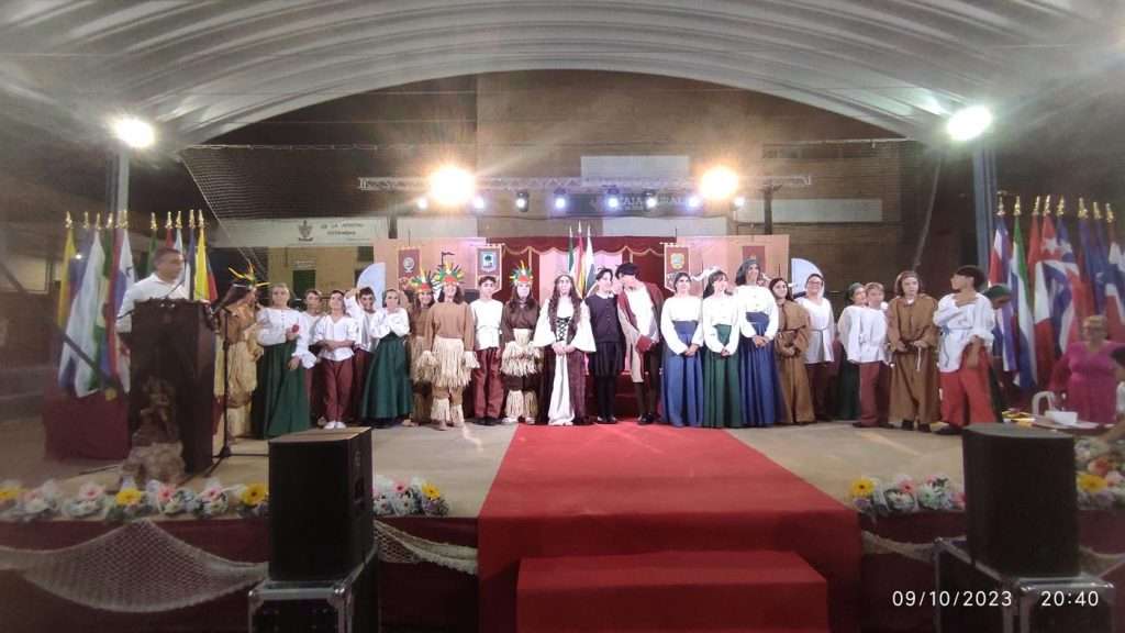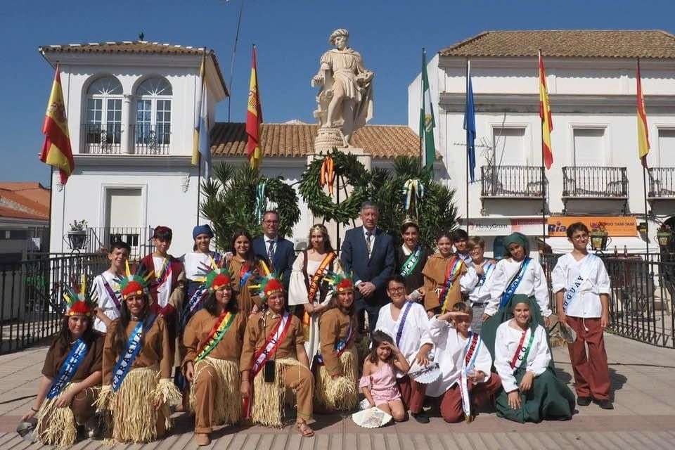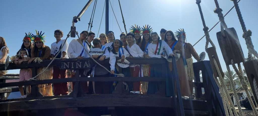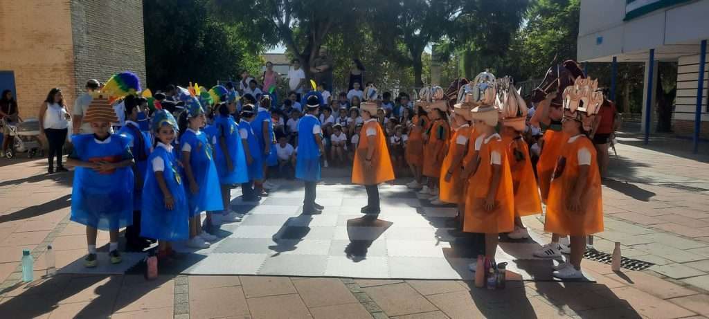 Las Fiestas de la Hispanidad empezaban con su Pregón y Coronación, este año muy especial porque el cortejo lo formaban 25 niños y niñas del grupo de teatro del Colegio que recreaban históricamente el Descubrimiento. Siendo la reina de las fiestas, la alumna que representaba a Isabel de Castilla y su corte representaba a cada uno de los países latinoamericanos, Huelva, Andalucía e Hispanidad.