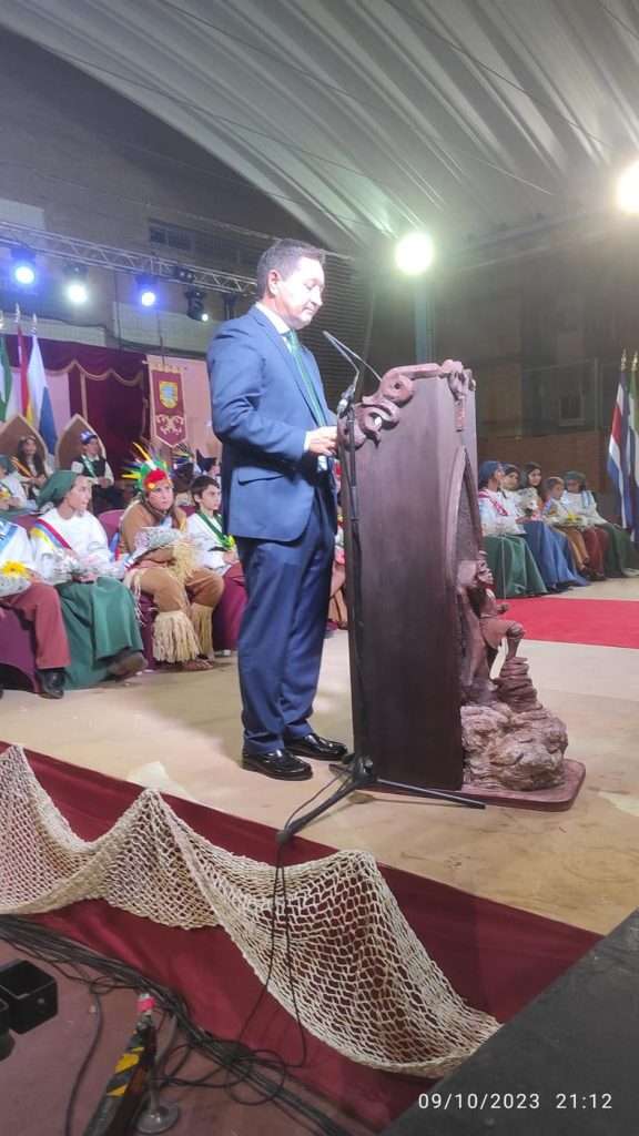 El presentador el director, Antonio Soto, el pregonero el presidente, Pedro Oliveira y la Hispánica 2023, la maestra fundadora, Lola Cenizo. Todo un honor.