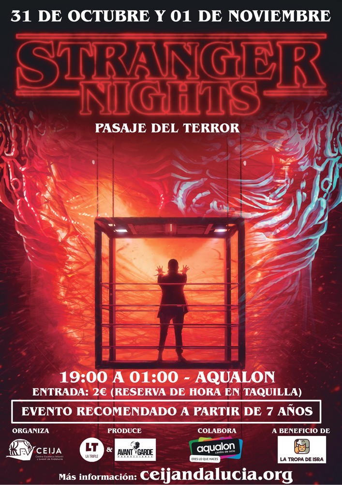 Este año presenta varias novedades que serán la delicia del público onubense: en primer lugar, la temática, inspirada en el aclamado universo de “Stranger Things”, siendo de hecho el título del pasaje “Stranger Nights”; en segundo lugar, la producción correrá a cargo de la compañía teatral de Huelva, La Triple, y la productora de eventos argentina, Avant Garde Producciones, junto a la participación directa del alumnado y familias del CEIJA; en tercer lugar, los días del evento serán dos, el 31 de octubre y 01 de noviembre de 19:00 a 01:00, con la taquilla abierta desde una hora antes, a fin de que el público pueda ir y disfrutar cuando mejor le convenga; y en cuarto lugar, ¡se acabaron las largas colas de espera! Se podrán conseguir las entradas en la taquilla, justo en la planta baja, con reserva de hora, es decir, que el público solo tiene que ir, obtener su entrada sabiendo la hora aproximada de cuándo le toca, y disfrutar por la zona hasta entonces, evitando así aglomeraciones o extensas esperas de pie.