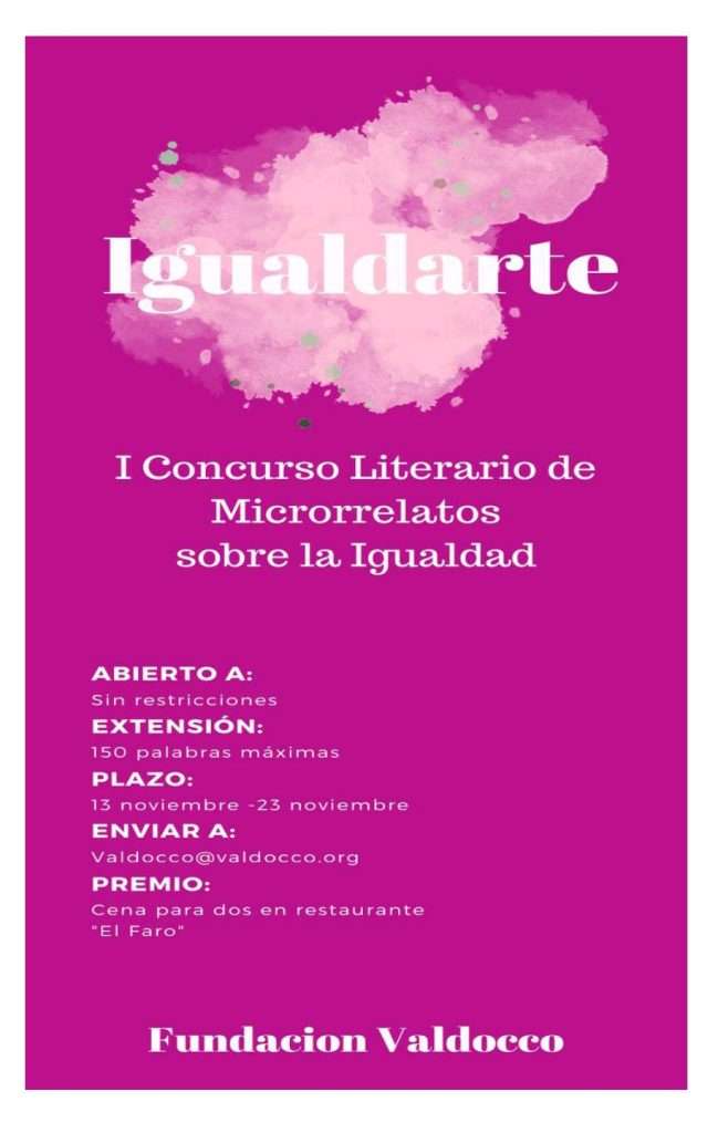 Comenzando con el lanzamiento del I Concurso de Microrrelatos sobre la Igualdad, en el cual todas las personas interesadas podrán mandar sus creaciones centradas en la igualdad de género, con textos que no superen las 150 palabras, al correo valdocco@valdocco.org. La persona ganadora disfrutará de una cena para dos personas en el restaurante “El Faro”.
