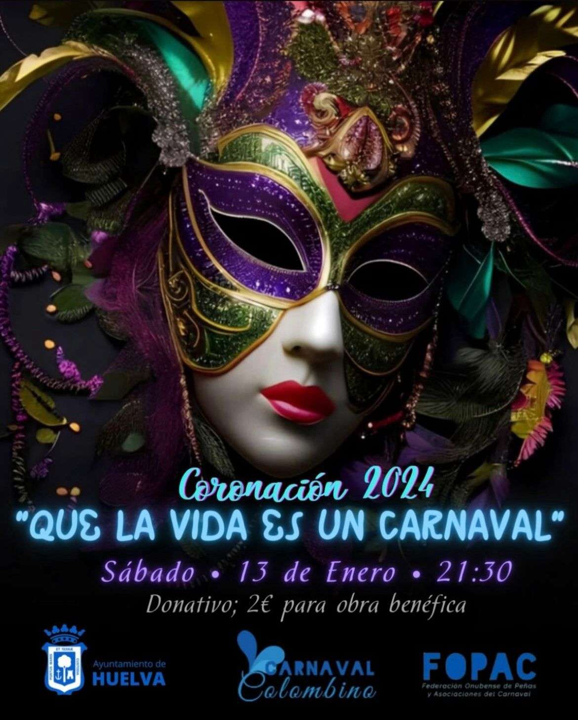 La Federación Onubense de Peñas y Asociaciones del Carnaval, FOPAC, invita a todos los medios, aficionados y onubenses al pregón del Carnaval Colombino 2024.