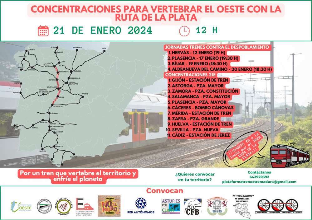 En una iniciativa sin precedentes, ciudadanía y organizaciones de diversos territorios se movilizan para reclamar la vertebración del oeste a través del tren Ruta de la Plata. Bajo el lema «Vertebración del Oeste a través del Tren Ruta de la Plata«, se han programado diversas acciones previas a las concentraciones descentralizadas del 21 de enero.