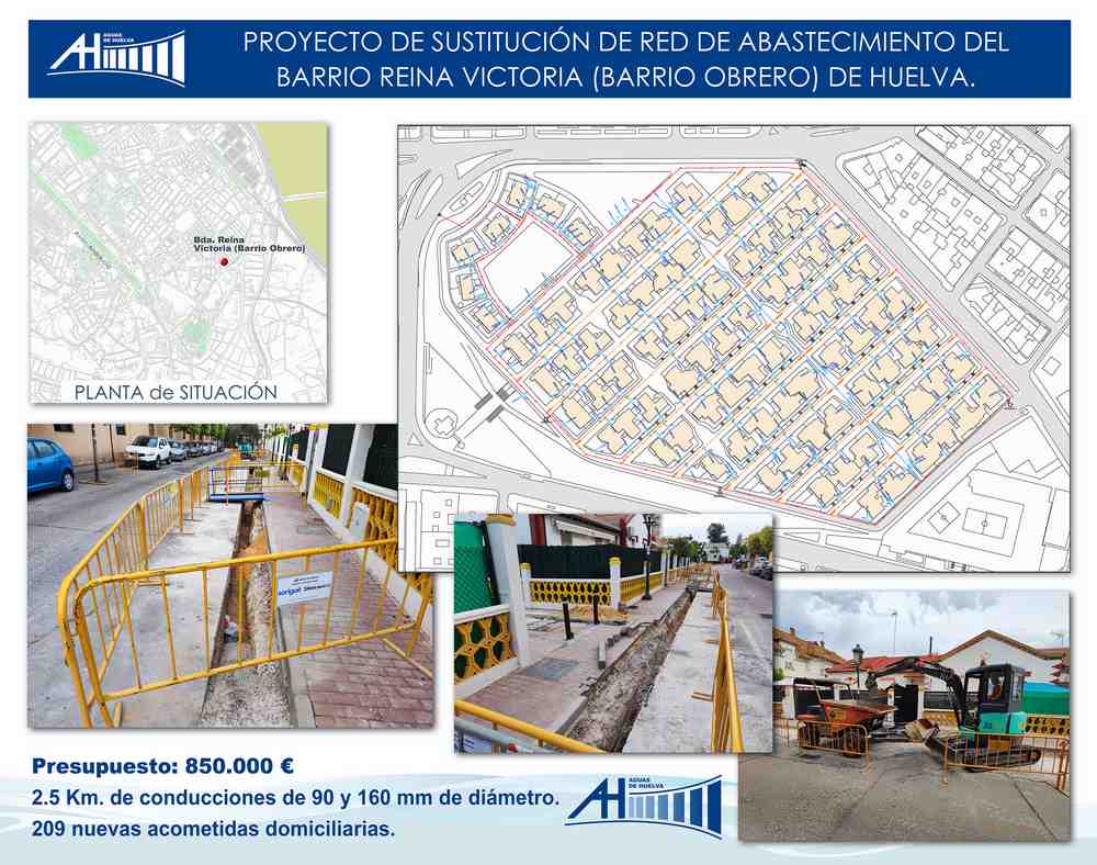 Con un presupuesto de 850.000 €, el proyecto ha comprendido la sustitución de todo el entramado interior de la barriada Reina Victoria que incluyen la calle Transversal, y las calles A, B, C, D, E, F, G, H e I. En una actuación anterior se renovó toda la red de abastecimiento perimetral de la barriada correspondiente al paseo Norte, paseo Circunvalación y calle Presbítero Francisco Gaona.