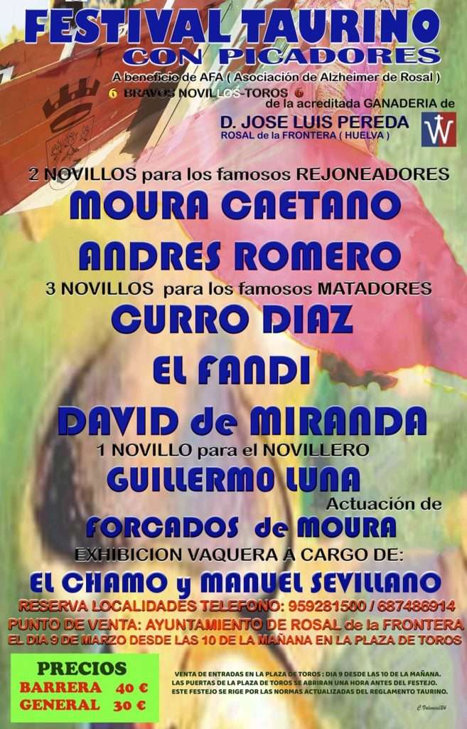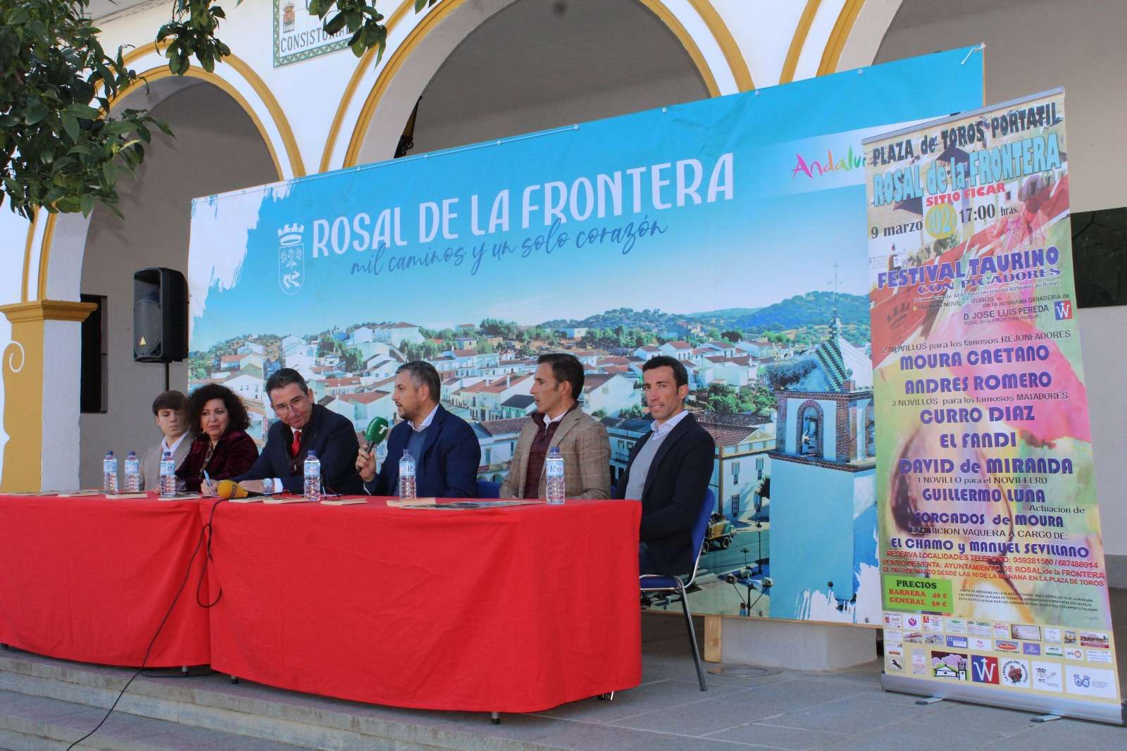 Hoy, viernes 2 de febrero, ha sido presentado el Cartel del Festival Taurino Benéfico que se celebrará el próximo sábado 9 de marzo, en la localidad onubense de Rosal de la Frontera. En un acto público en la Casa Consistorial ante los vecinos, toreros, prensa y aficionados, se ha dado a conocer el cartel de este excepcional festejo en el que actuarán los rejoneadores Moura Caetano y Andrés Romero, a pie los toreros Curro Díaz, David Fandila ‘El Fandi’ y David de Miranda, y el novillero Guillermo Luna. Además intervendrán durante el festejo los Forcados de Moura y realizarán una exhibición vaquera los prestigiosos caballistas ‘El Chamo y Manuel Sevillano. El festival lidiará novillos-toros el sábado 9 de marzo, a las 17:00h, en una plaza portátil que se instalará en las instalaciones del Ficar.