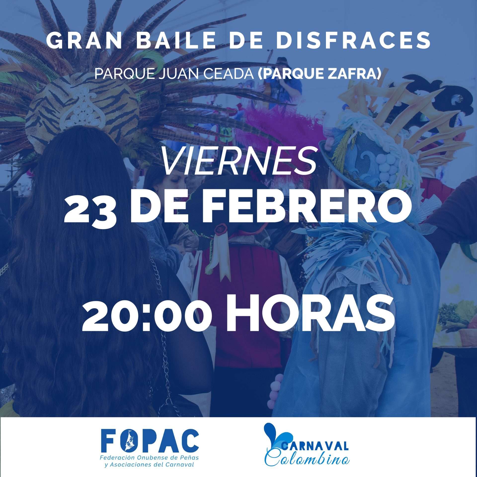 El viernes 23 de febrero tendremos nuestro GRAN BAILE DE DISFRACES que se celebrará a partir de las 20:00 en el Parque Zafra, en la carpa instalada. Contaremos con un DJ para tal ocasión que se prolongará hasta las 3:00 AM. ¡INDISPENSABLE VENIR DISFRAZADO!