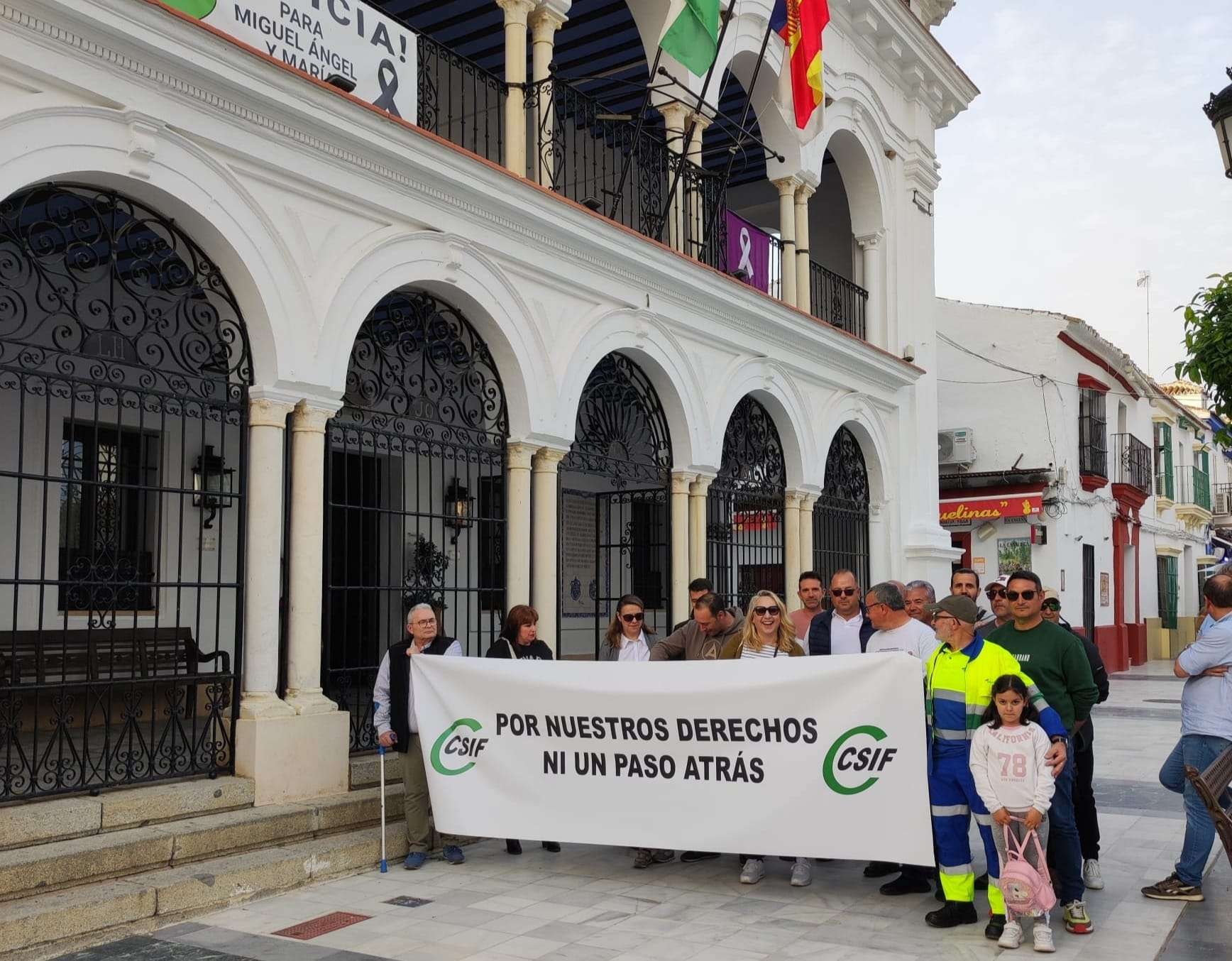 Los trabajadores de Giahsa que se han integrado en Aqualia protagonizaron ayer la primera concentración de su calendario de movilizaciones a las puertas del Ayuntamiento de Almonte para que la empresa cumpla con el compromiso de respetarles los derechos adquiridos en Giahsa.