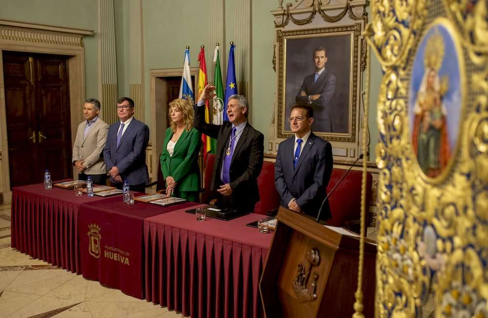 Con el delicioso olor de las rosas enmeladas, las tortas de azúcar y almendras, y esa cidra, con la que se reinventa el concepto del Cabello de Ángel, el Salón de Plenos del Ayuntamiento capitalino se ha rendido un año más a las tradiciones de la Puebla de Guzmán de la mano de la filial onubense de la Hermandad de la Peña que ha activado la cuenta atrás para su romería con la presentación de un cartel “muy de Huelva”. La alcaldesa, Pilar Miranda, ha presidido el acto junto al alcalde de la localidad andevaleña, Antonio Beltrán, felicitando a la hermandad “por un cartel que consigue unir La Puebla con la ciudad” reconociendo “un verdadero orgullo al contemplar imágenes tan características de Huelva, como el Santuario de La Cinta o el Muelle del Tinto, junto a la bellísima estampa de la Virgen de la Peña”.