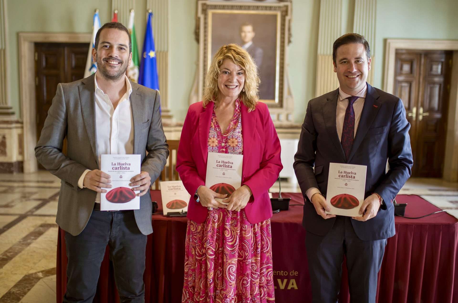 La alcaldesa de Huelva, Pilar Miranda; acompañada del concejal de Cultura y Patrimonio Arqueológico, Nacho Molina, ha presentado esta mañana en Salón de Plenos del Ayuntamiento el libro “Huelva Carlista. Historia de una Contrarrevolución Incompleta (1931-1945)” del autor onubense Juan Ignacio González Orta, que se ha alzado con el XXIII edición Premio de Investigación Diego Díaz Hierro.