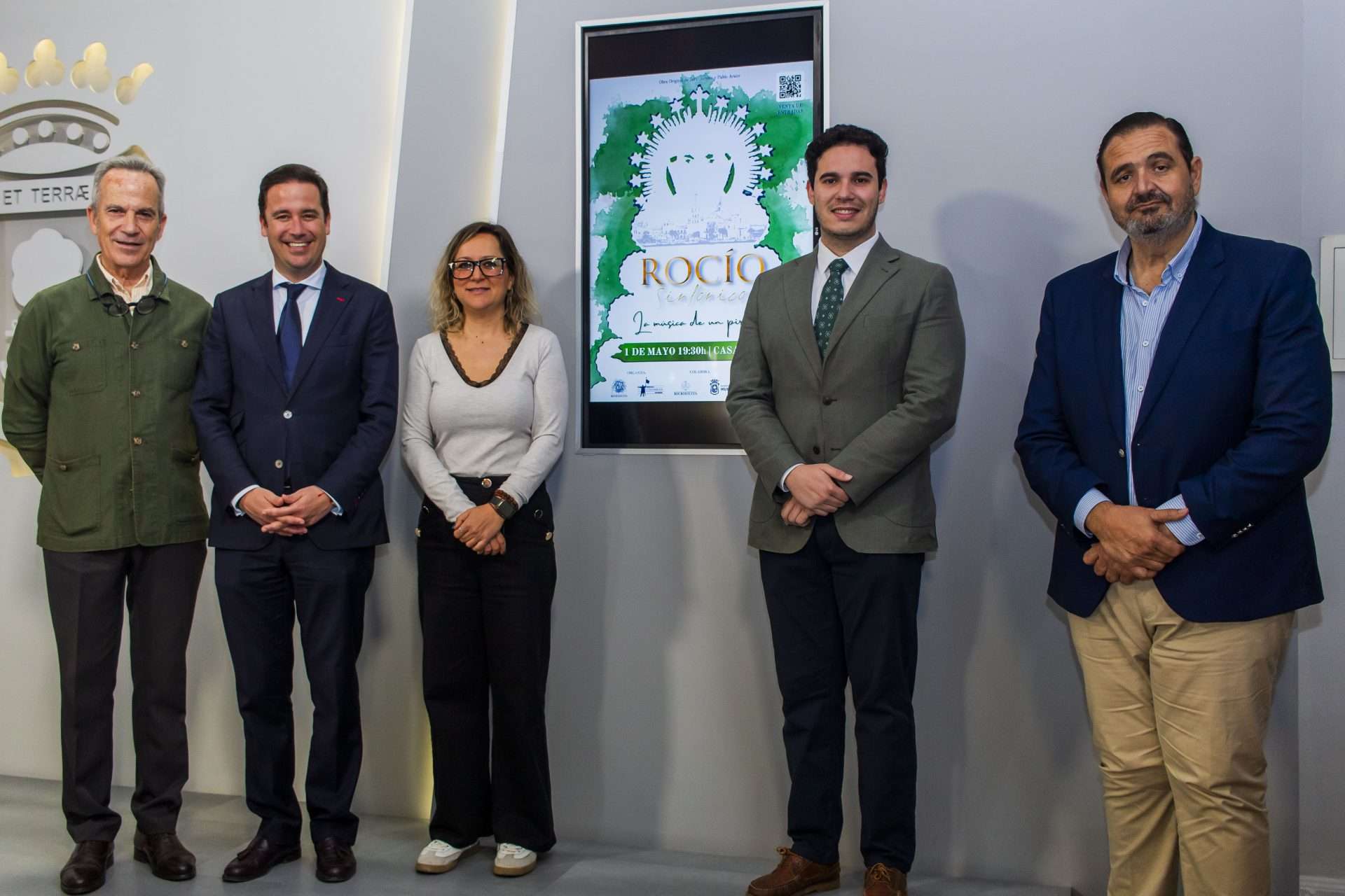 El concejal de Cultura y Patrimonio Arqueológico, Nacho Molina; la coordinadora del Instituto Andaluz de la Juventud en Huelva, Ángela Ramos; el presidente de la Hermandad del Rocío de Huelva, Juan Carlos Rubio; el director del Coro Joven de la Hermandad del Rocío de Huelva, Jero Garrido, y el director de la Orquesta Colombina Onubense, Pablo Arazo, han presentado en rueda de prensa el evento cultural ‘Rocío Sinfónico’, un espectáculo musical que une la música popular rociera con los acordes sinfónicos de una orquesta clásica.