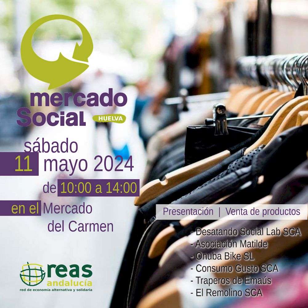 Hoy sábado 11 de mayo de 2024 desde el grupo local de REAS en Huelva se pondrá en marcha el Mercado Social, este tendrá lugar en horario de 10h a 14h y estará ubicado junto el mercado de El Carmen (Huelva), en él participaran entidades vinculadas a la economía alternativa y solidaria de la provincia de Huelva, entre ellas estarán presentes las cooperativas de El Remolino Soc. Coop. And. y Desatando Ideas Soc. Coop. And., las empresas de inserción Onuba bike y Traperos de Emaús y la Asociación Matilde para la Protección e Interpretación del Patrimonio Glocal.