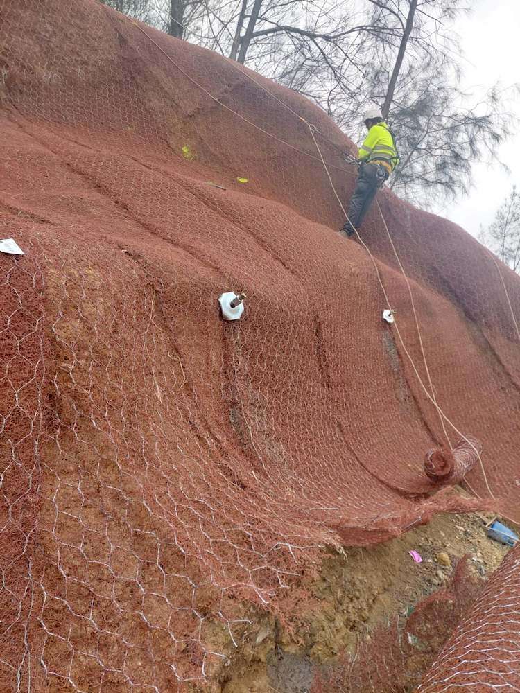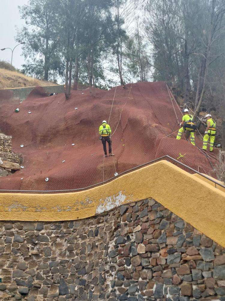 Los trabajos, situados junto a las escaleras de la calle Arquitecto Monís, comenzaron el pasado 10 de junio y están a punto de finalizar. Las tareas han incluido la limpieza y preparación del talud, incluyendo la tala de arboleda y desbroce de matorral, por prescripción técnica, para poder instalar el sistema de contención que ha cubierto una zona de 300 metros cuadrados. Mediante perforación, roscado, tuerca y placa de anclaje se ha instalado una estructura de cable de acero para sistema de estabilización superficial, reforzado mediante muro de gaviones de alambre electrosoldados y malla geotextil.
