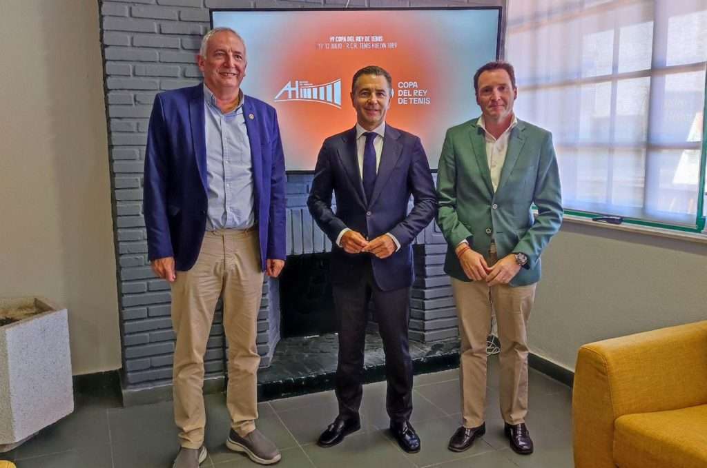 El director gerente de Aguas de Huelva, Pedro Peña, acompañado del primer teniente alcalde de Urbanismo y Medio Ambiente del Ayuntamiento de Huelva y presidente de la empresa, Felipe Arias, han visitado la sede del Real Club Recreativo de Tenis de Huelva para renovar con el presidente del club, Rafael Romero, el acuerdo de colaboración que une a ambas entidades en la celebración de la 99ª edición de la copa del rey.