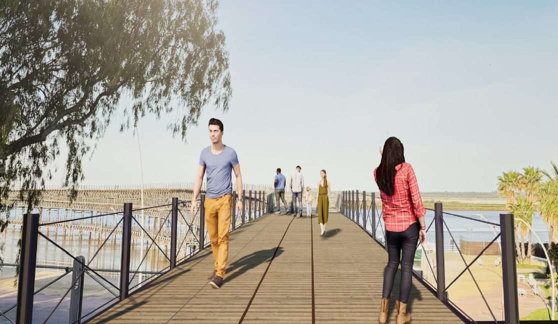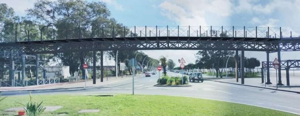 Por otro lado, el jefe del Área de Infraestructuras del Puerto de Huelva ha explicado que el proyecto consiste en la unión de los dos tramos actuales en su nivel superior, mediante la colocación de un tablero formado por dos vigas de celosía metálicas igual a las actuales, apoyadas sobre dos nuevos pórticos de pilares cimentados mediante micropilotes. El pavimento del nuevo tramo estará formado por lamas de prfv (Poliéster Reforzado de Fibra de Vidrio), similares a las ya colocadas en el entorno del muelle. La barandilla del nuevo tramo estará formada por bastidores verticales similares a los actuales y redondos de unión, se complementará con un cristal pde policarbonato para cumplir con las recomendaciones de seguridad y evitar la caída de objetos a la calzada.