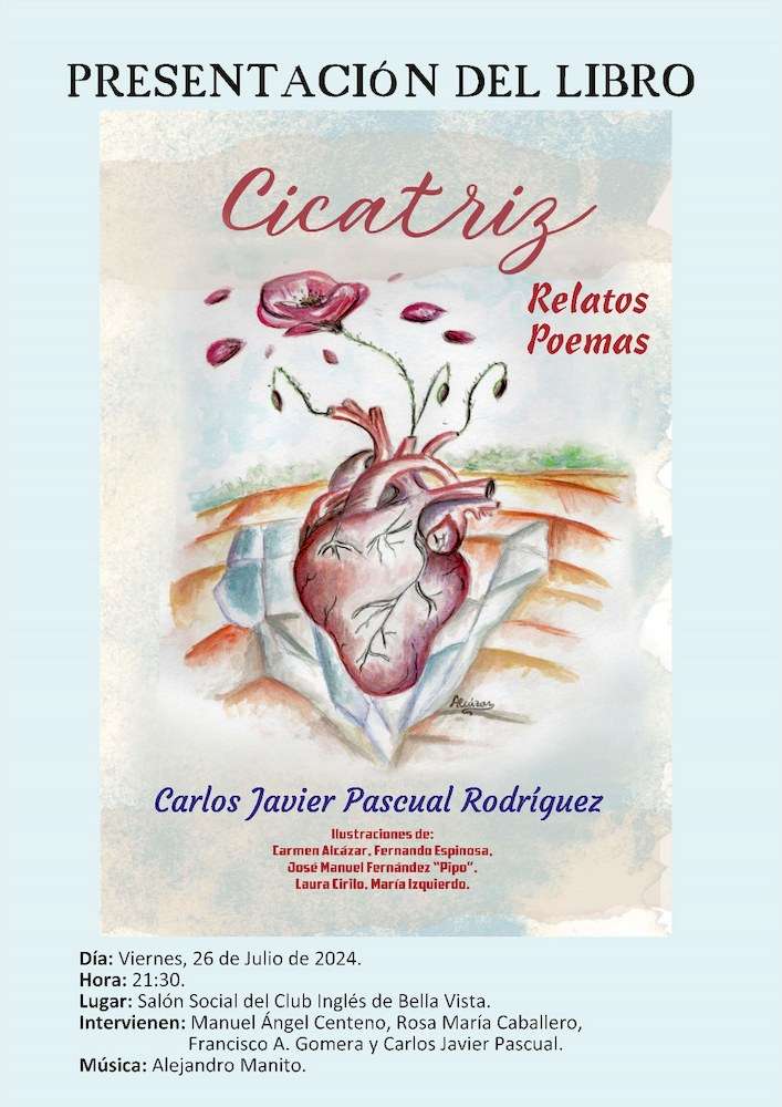 El salón social del Club Inglés de Bella Vista en Minas de Riotinto acoge este viernes 26 de julio (21.30 h.) la presentación de Cicatriz, el primer libro del riotinteño Carlos Javier Pascual. En dicho acto, además del propio autor, intervendrán Manuel Ángel Centeno, Rosa María Caballero y Francisco A. Gomera, mientras que Rafael Sousa y Manoli González recitarán los versos acompañados de la música de Alejandro Manito.
