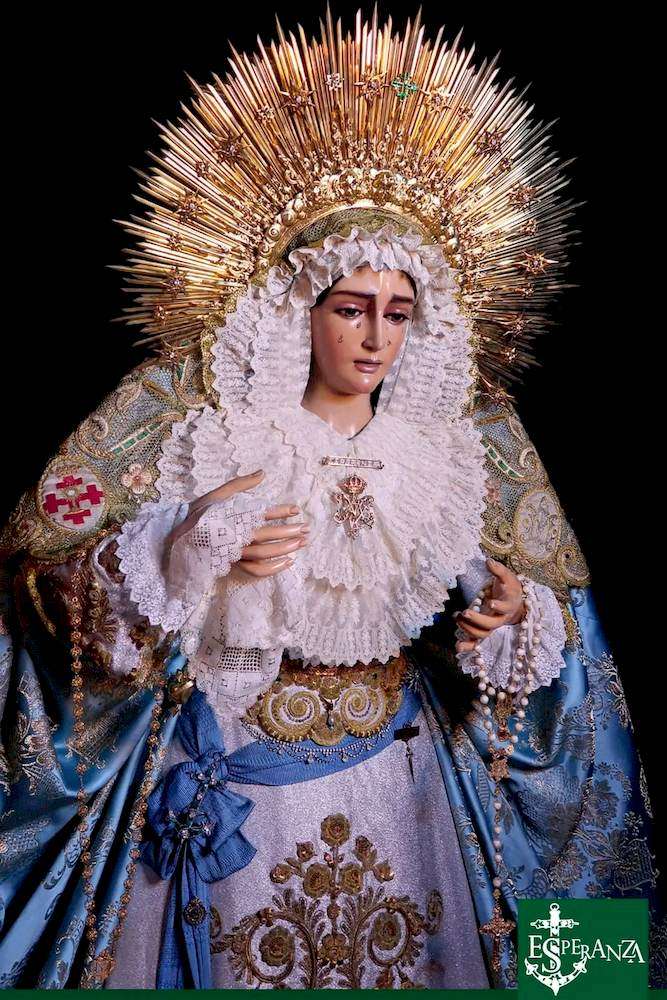 La pieza presenta una nube con pequeños querubines que sustentan rayos lisos, colocados de forma irregular, en su parte superior y con roleos en su parte inferior. Los haces de rayos se encuentran dispuestos en dos planos. El primero, más corto, va rematado con estrellas en plata y piedras preciosas y, en su centro, Cruz recrucetada en pedrería verde. El segundo haz de rayos es más largo que el anterior y se encuentra sobredorado. En la base de la presea, debajo de la nube, se encuentra grabada la leyenda “María, Esperanza Ante el Tercer Milenio”, lema de la Coronación Canónica de la Virgen de la Esperanza.