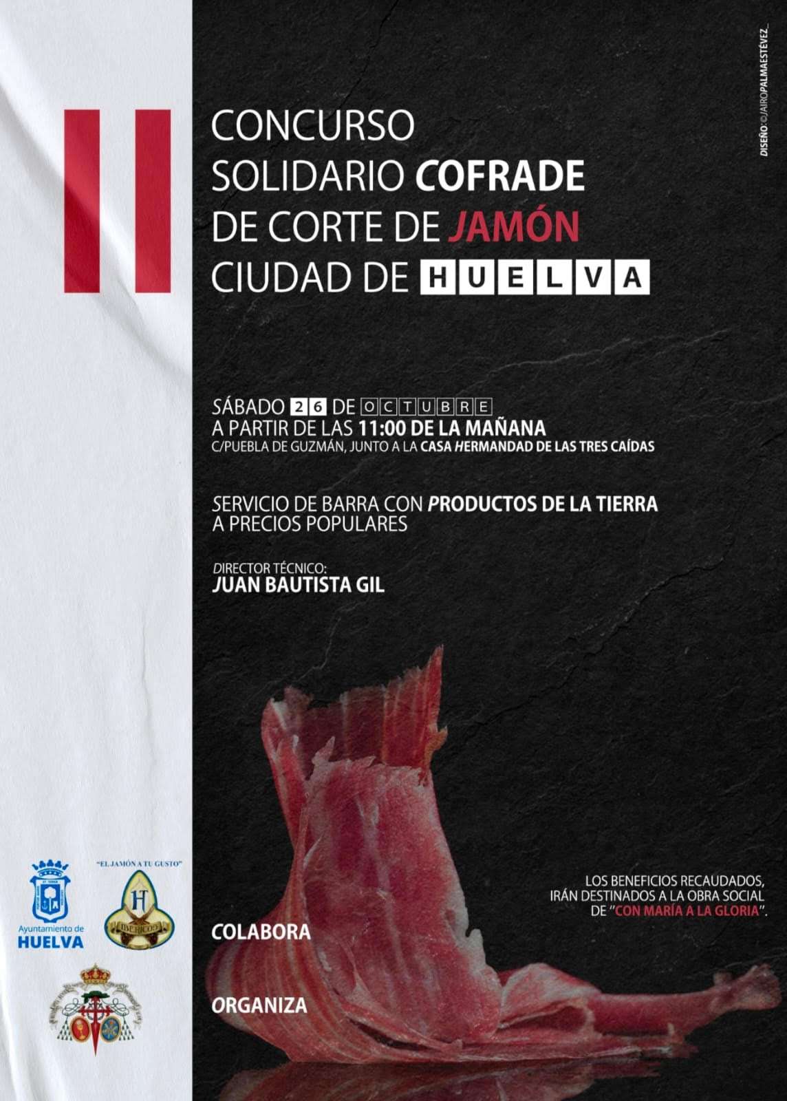 El próximo sábado, 26 de octubre, la Hermandad de las Tres Caídas organiza la segunda edición del Concurso Solidario Cofrade de Corte de Jamón «Ciudad de Huelva», bajo la dirección técnica del maestro cortador Juan Bautista Gil, que servirá como punto de encuentro para la familia cofrade. El evento, que cuenta con la colaboración del Ayuntamiento de Huelva, tendrá lugar en la Calle Puebla de Guzmán de Huelva, junto a la Casa-Hermandad de las Tres Caídas, y dará comienzo a las 11:00 horas.