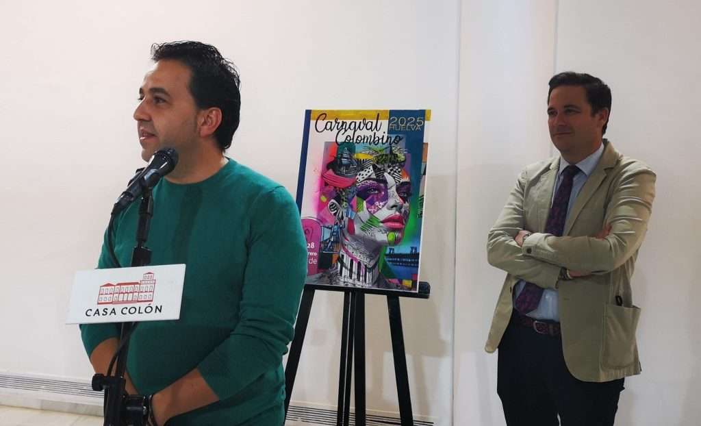 La alcaldesa de Huelva, Pilar Miranda y el concejal de Cultura del Ayuntamiento de Huelva, Nacho Molina, arropados por representantes de peñas y asociaciones carnavaleras, agrupaciones, artistas, carnavaleros y carnavaleras onubenses, han descubierto el cartel del Carnaval Colombino 2025 en un acto celebrado esta tarde en el Salón de Brazos de la Casa Colón. Se desvelaba así la obra ‘Vanguardista, Creativa Carnavalera’ del polifacético artista onubense Chema Riquelme que con el 30.48% de los votos se alza como imagen representativa de la próxima edición.