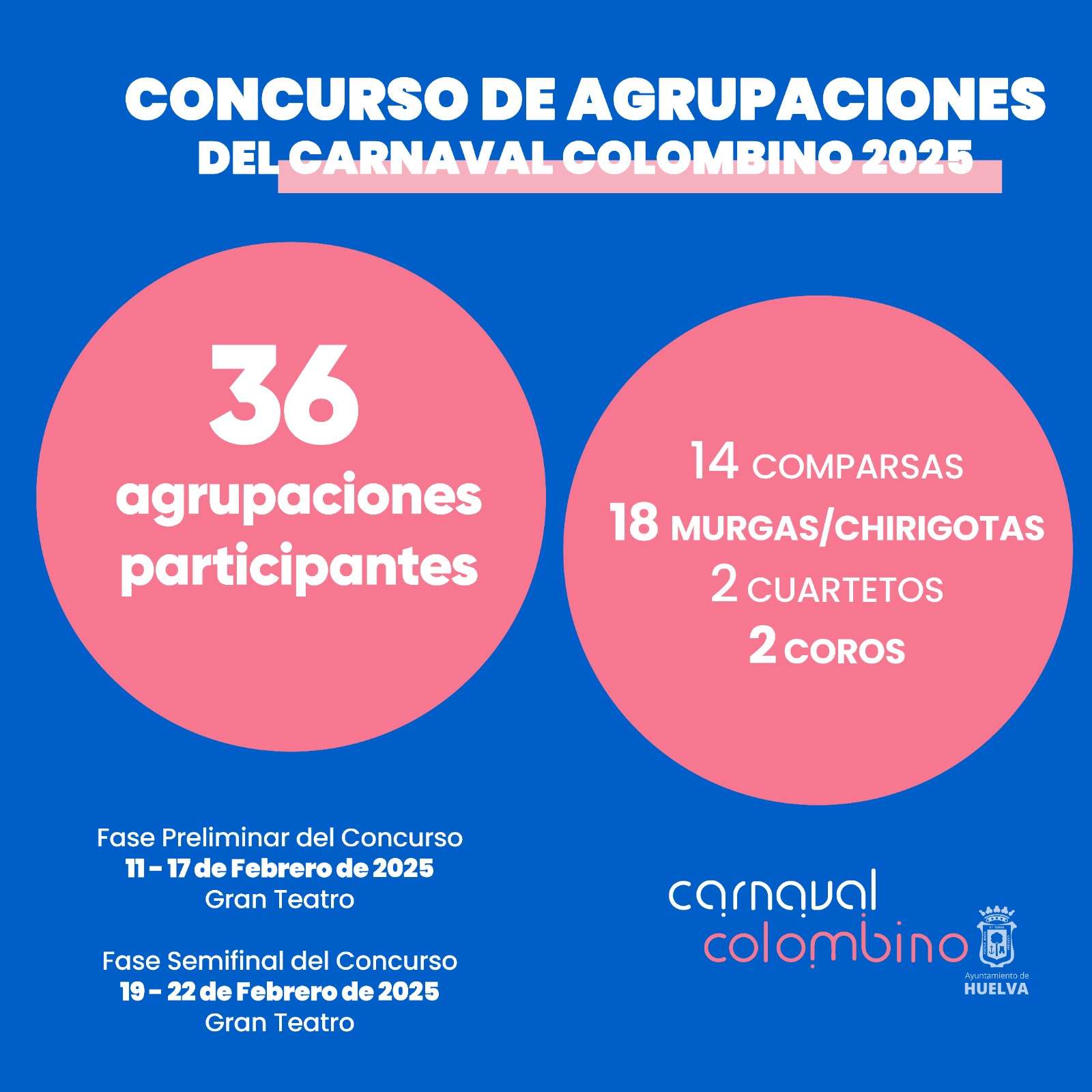 Tras analizar el listado final y encontrar una duplicidad en una de las agrupaciones inscritas, se cierra el número de participantes al Concurso de Agrupaciones del Carnaval Colombino con 36 grupos: 14 comparsas, 18 chirigotas o murgas, 2 coros y 2 cuartetos.