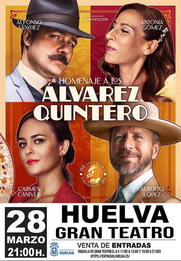 Finalmente, para cerrar esta programación con la que el Ayuntamiento de Huelva celebra la efeméride, el Gran Teatro acoge el viernes 28 un homenaje a los Hermanos Álvarez Quintero de la mano de Alfonso Sánchez y Alberto López, los populares compadres, acompañados por las actrices Carmen Canivelli y Antonio Gómez. Se trata de una obra creada para celebrar los 150 años del nacimiento de Serafín Álvarez Quintero, recuperando para los circuitos algunas de sus piezas más carismáticas, para poner en valor la calidad de sus textos.