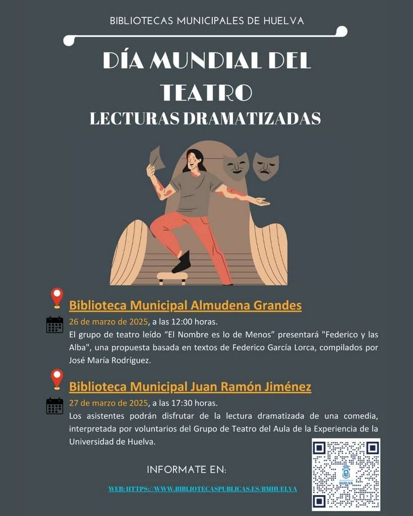 El Ayuntamiento de Huelva ha decidido poner el foco en la Red Municipal de Bibliotecas para celebrar el Día Mundial del Teatro, que se conmemora cada 27 de marzo, con el objetivo de honrar este arte milenario que ha sido testigo de la historia de la humanidad y que sigue siendo un espacio de expresión, creatividad y transformación. Se trata, como explica el concejal de Cultura y Patrimonio Arqueológico, Nacho Molina “de celebrar desde nuestras bibliotecas, como espacios libres, diversos y abiertos para el acceso a la cultura y el conocimiento, el teatro en todas sus formar y destacar su papel como herramienta de diálogo, educación y cambio social”.