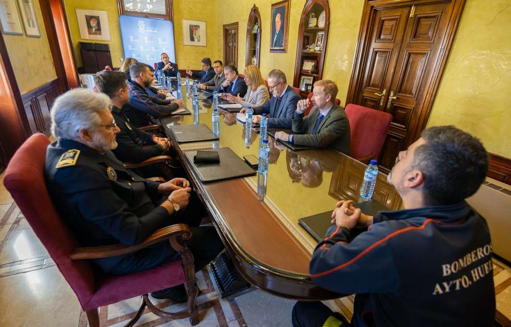 Pilar Miranda y Antonio Sanz presiden una reunión de trabajo con Policía Local, Bomberos y Protección Civil para establecer los procedimientos y protocolos ante cualquier situación que ponga en peligro a los onubenses
