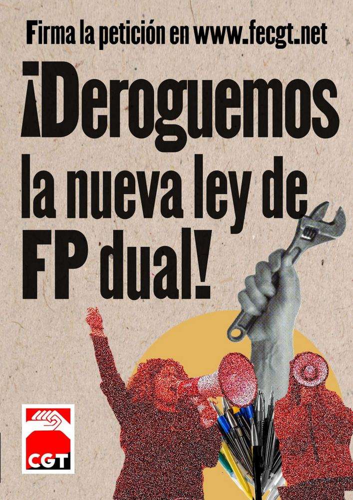 CGT Enseñanza Huelva hace un llamamiento a toda la comunidad educativa para que asistan a la concentración que tendrá lugar el miércoles 2 de abril a las 11:15 horas en el Mirador Ciudad Deportiva de Huelva (Explanada de Arrabales) para exigir la derogación de la FP Dual actual, una regulación estricta y transparente de la FP que impida abusos y asegure que el alumnado no sea empleado sin derechos bajo la excusa del aprendizaje y más inversión en infraestructuras públicas, más plazas en centros educativos, una reducción de ratios y una mejora de las condiciones laborales del profesorado.