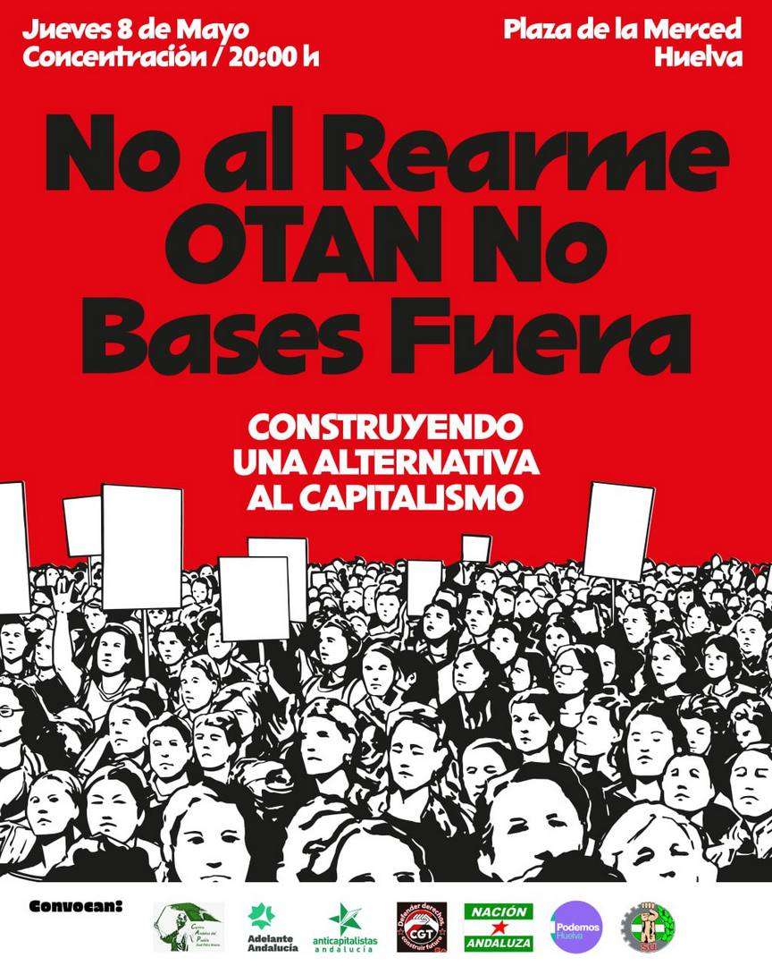 El próximo jueves día ocho de mayo, a partir de las 20 horas, hay convocada una concentración popular, en la Plaza de la Merced de nuestra capital, contra los planes de rearme del Gobierno español. El lema de la concentración es: «No al rearme. OTAN no. Bases fuera. Construyendo una alternativa al capitalismo«. Esta movilización se encuadra en un esquema de acción de nivel andaluz en el que diversas fuerzas y organizaciones sociales invitan a la ciudadanía a pronunciarse sobre los planes de rearme y de políticas de guerra que han emprendido los gobiernos de la UE, incluido el español.