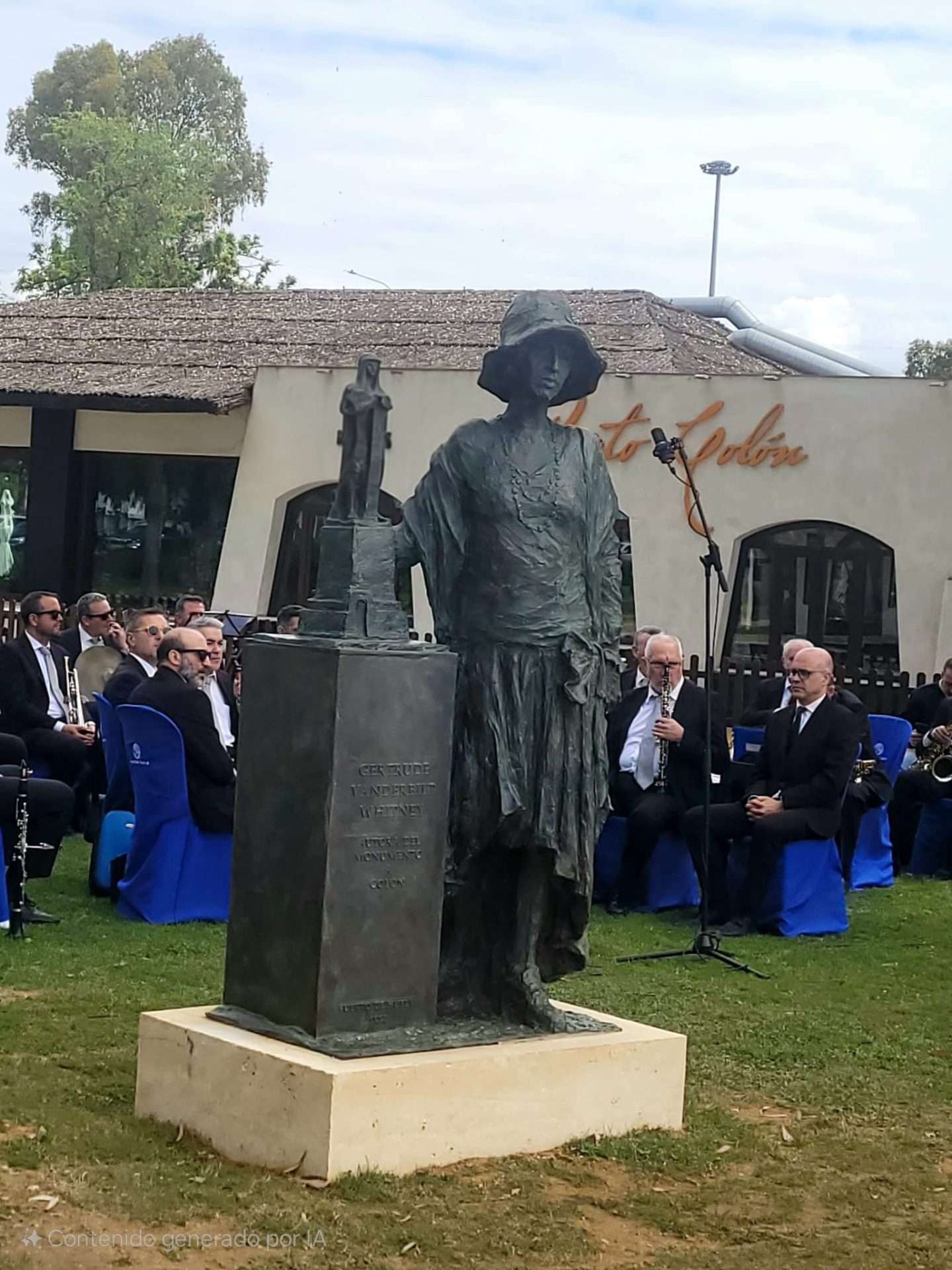 Huelva, 9 de mayo de 2025.- El entorno del Monumento a Colón, situado en la zona de servicio del Puerto de Huelva en la Punta del Sebo de Huelva, cuenta desde hoy con una escultura homenaje a su escultora, la artista norteamericana Gertrude Vanderbilt Whitney, más conocida en Huelva como Miss Whitney. La escultura es obra del escultor onubense Martín Lagares (La Palma del Condado) y está inspirada en el día de la inauguración del monumento, el 21 de abril de 1929, puesto que consiste en una reproducción de la figura de Miss Whitney a partir de una fotografía que se tomó ese día, en la que la escultora aparece junto al boceto del Monumento a Colón.
