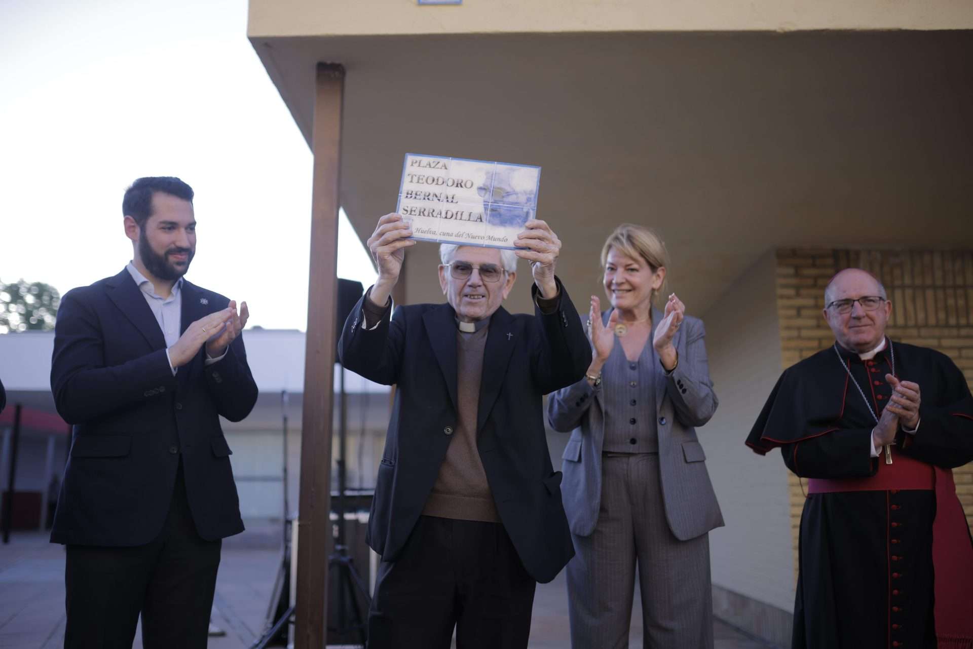 La alcaldesa de Huelva, Pilar Miranda; acompañada por el Obispo de Huelva, Santiago Gómez; el presidente de la Asociación de Vecinos de La Hispanidad, Andrés García; el hermano mayor de la Hermandad del Cautivo, Antonino Gómez, y el propio homenajeado, el párroco de La Hispanidad, Teodoro Bernal han asistido hoy a la rotulación de la plaza que a partir de hora llevará el nombre del sacerdote.