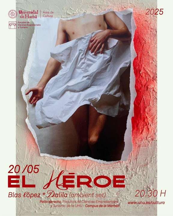 El próximo martes 20 de mayo, a las 20.30 horas, la Facultad de Ciencias Empresariales y Turismo de la Universidad de Huelva será escenario de la performance EL HÉROE, una creación del artista multidisciplinar onubense Blas López, con la participación activa de la DJ Dalila. La intervención artística se celebrará en el patio derecho de dicha Facultad.