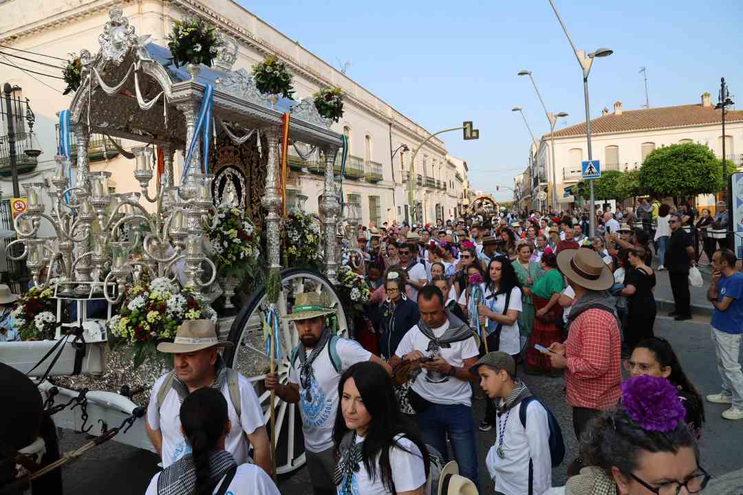 Como cada miércoles previo al Lunes de Pentecostés, San Juan del Puerto se ha echado al camino. A las ocho de la mañana, la carreta de plata restaurada el pasado año y que porta el Simpecado que Esperanza Elena Caro confeccionara en 1972, ha empezado a transitar los primeros metros por el casco urbano, por la Avda. de Andalucía y calles Huelva, Plaza de la Iglesia, Real, Toledo, Avda. de la Esperanza y Prado de San Sebastián, en un ambiente de alegría que perdurará unas 34 horas, momento en el que llegará a la Casa-Hermandad que la filial décima de la Matriz de Almonte, fundada en 1913, dispone en pleno Real de El Rocío.