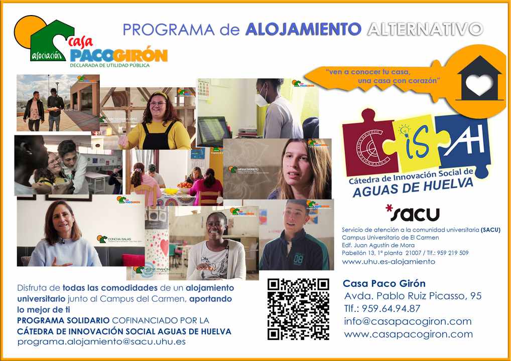 La Cátedra de Innovación Social de Aguas de Huelva patrocina la puesta en marcha de este Programa de Alojamiento Alternativo, que permite a estudiantes de la Universidad de Huelva alojarse en la Casa Paco Girón y participar en las actividades cotidianas de la casa por un precio simbólico.
