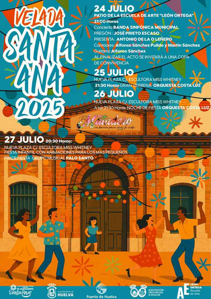 Santa Ana, celebración perdida y que en tiempos pasados se disfrutaba de forma habitual en nuestro barrio, siendo una de las fiestas más antigua de los barrios de Huelva. Data del último tercio del siglo XIX, cuando se asentaron en estás zona las personas que venían de los pueblos mineros a trabajar en la compañía «Rio Tinto«, y trajeron de sus pueblos, sus costumbres y tradiciones que aquí arraigaron. Entre ellas la «VELADA DE SANTA ANA» Son por tanto estas unas jornadas festivas, de evasión, para disfrutar, viven de un modo apacible y abierto con todas las personas, no solamente de nuestro barrio, sino de la ciudad que nos visitan en estos días. Y también para de alguna forma, dinamizar el barrio. En definitiva, la VELADA DE SANTA ANA representa: La tradición, la convivencia, la alegría y la hospitalidad… Desde la Asociación, su presidente, José Luis Rebollo, invita a todos los vecinos, en particular, y a los onubenses, en general, a que participen en nuestra velada, vengan a nuestro Barrio y disfruten de nuestra VELADA DE SANTA ANA. ORGANIZA LA AVV SANTA ANA CONJUNTAMENTE CON EL