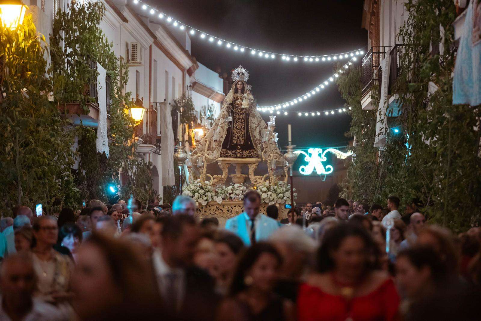 Las calles del municipio de la campiña onubense se han vestido de gala para recibir a la Virgen, con adornos tradicionales de flores de papelillos, altares, colgaduras, alfombras de sal, eucaliptos y plantas aromáticas que han embellecido el recorrido procesional. La Patrona triguereña ha paseado solemne por las calles Moguer, Antonio Machado, La Orden y la plaza que lleva su nombre acompañadas por los sones de la Banda de Música de Trigueros AMC. “José del Toro Camacho”.