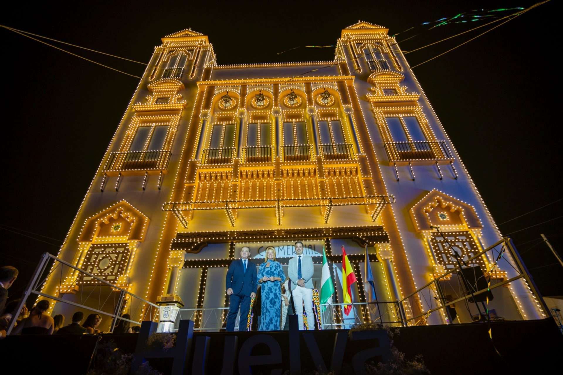 El otro protagonista del acto de inauguración de esta noche ha sido el edificio de El Comercial, actual sede de la Fundación Cajasol, que este año preside el recinto colombino con una recreación para la portada de 17,50 metros de ancho por 24 de alto y 6,6 de profundidad, iluminada por 84.000 puntos leds.