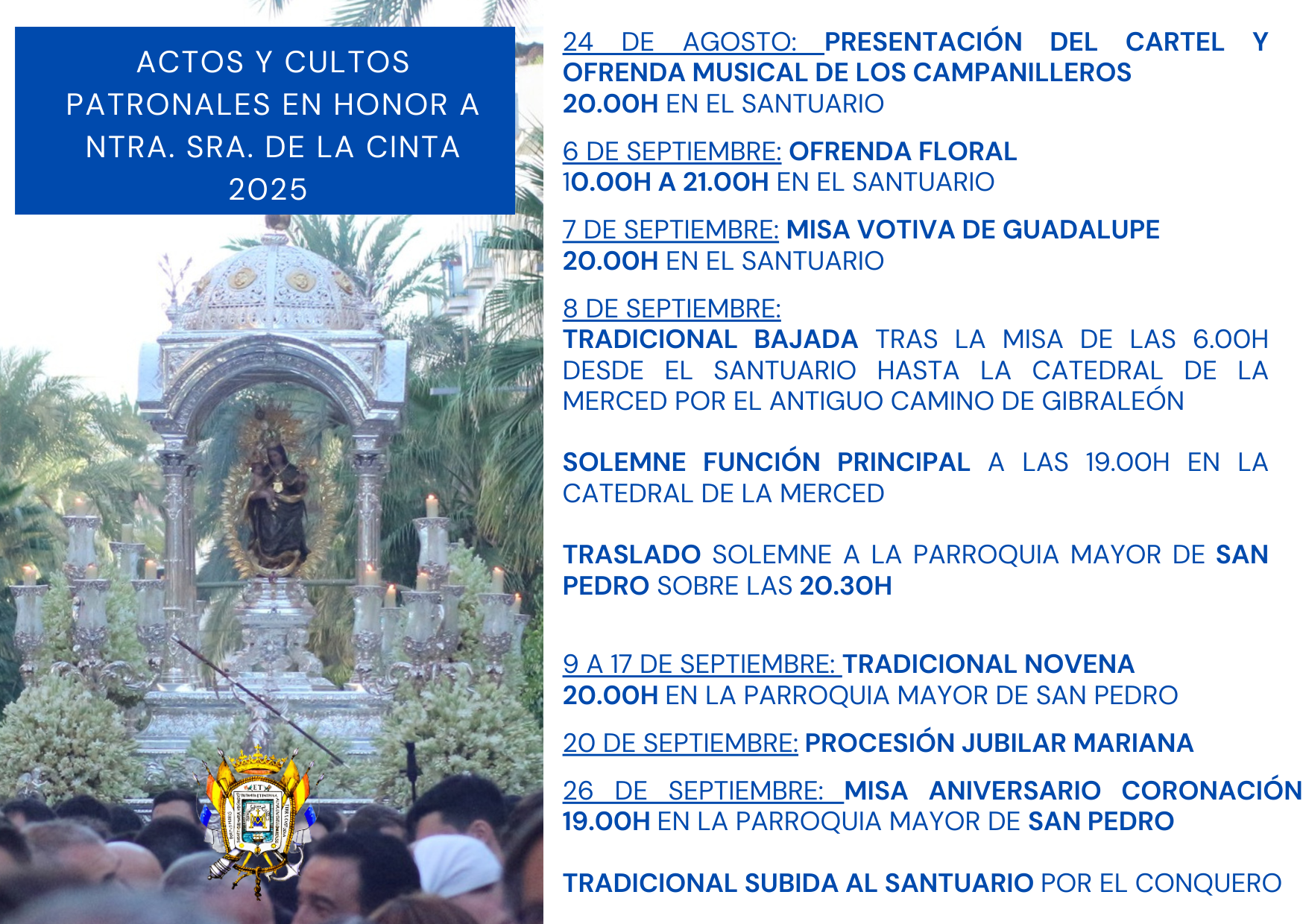 Los actos y cultos patronales en honor a Ntra. Sra. de la Cinta adoptarán este año un carácter extraordinario. La coincidencia con las celebraciones del Jubileo de la Esperanza, organizadas por la Diócesis durante septiembre —incluyendo el Congreso Mariológico y la Procesión Jubilar Mariana— ha llevado a la Hermandad a adaptar sus tradicionales cultos en homenaje a la Patrona.